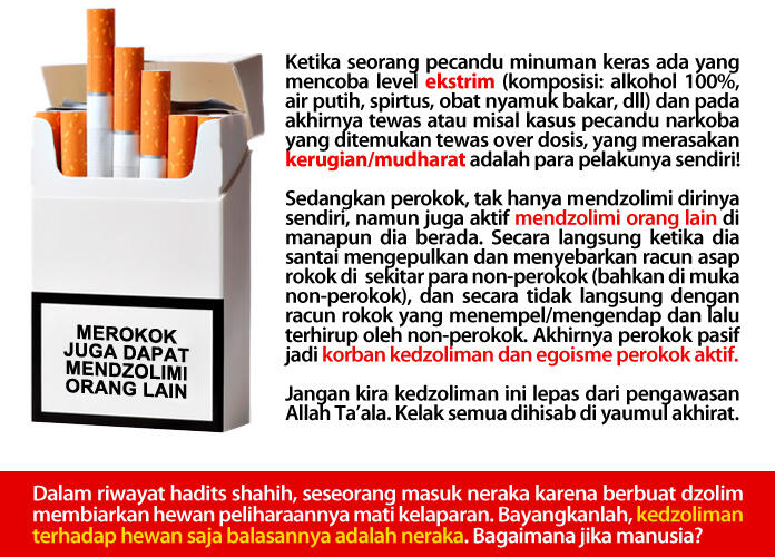 Quote:Nah berawal dari ngerokok niatnya hanya sebagai tuntutan pergaulangan, terus secara psikologis pengen dianggap keren, laki, macho dan jantan, akhirnya kebablasan jadi kebiasaan dan akhirnya ya berujung pada kecanduan rokok! Karena memang rokok punya kandungan-kandungan zat adiktif yang bersifat mencandu, seperti halnya yang terdapat pada narkoba. Jika tidak segera berhenti merokok, umumnya keterusan sampai usia tua. Anak cucu pun bisa menirukan, merupakan contoh yang buruk bagi keluarga! Rokok dan narkoba sama-sama merupakan bom waktu kehancuran, yang membedakan hanya kecepatan dalam merusaknya.